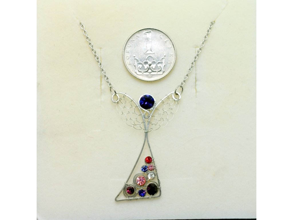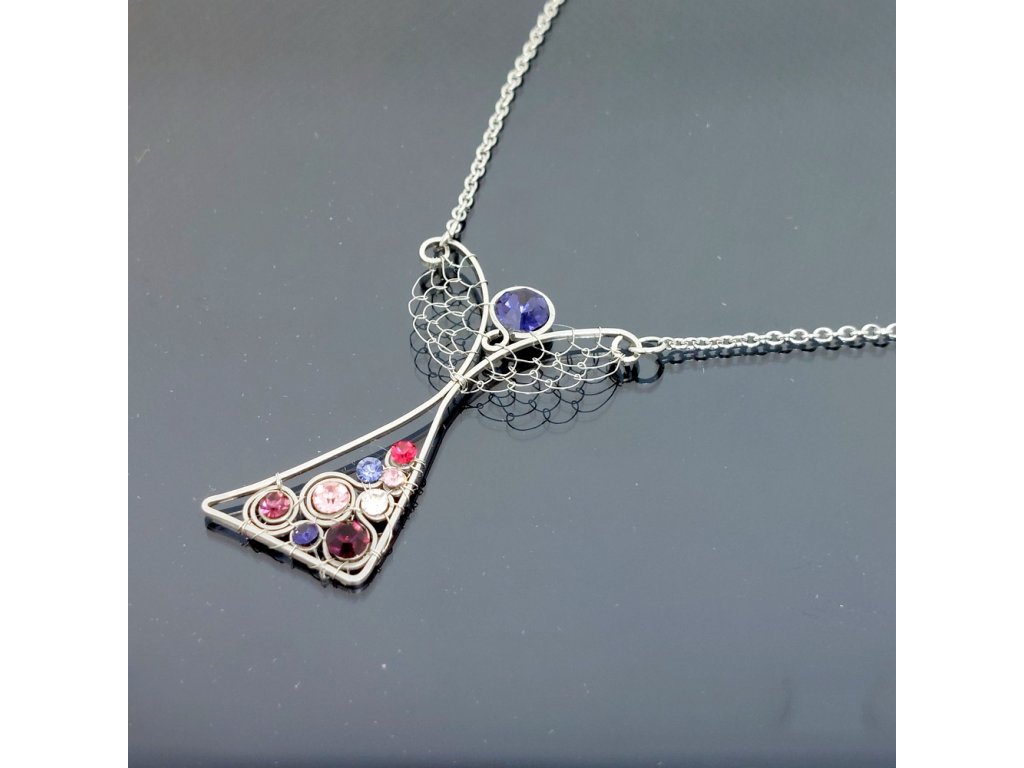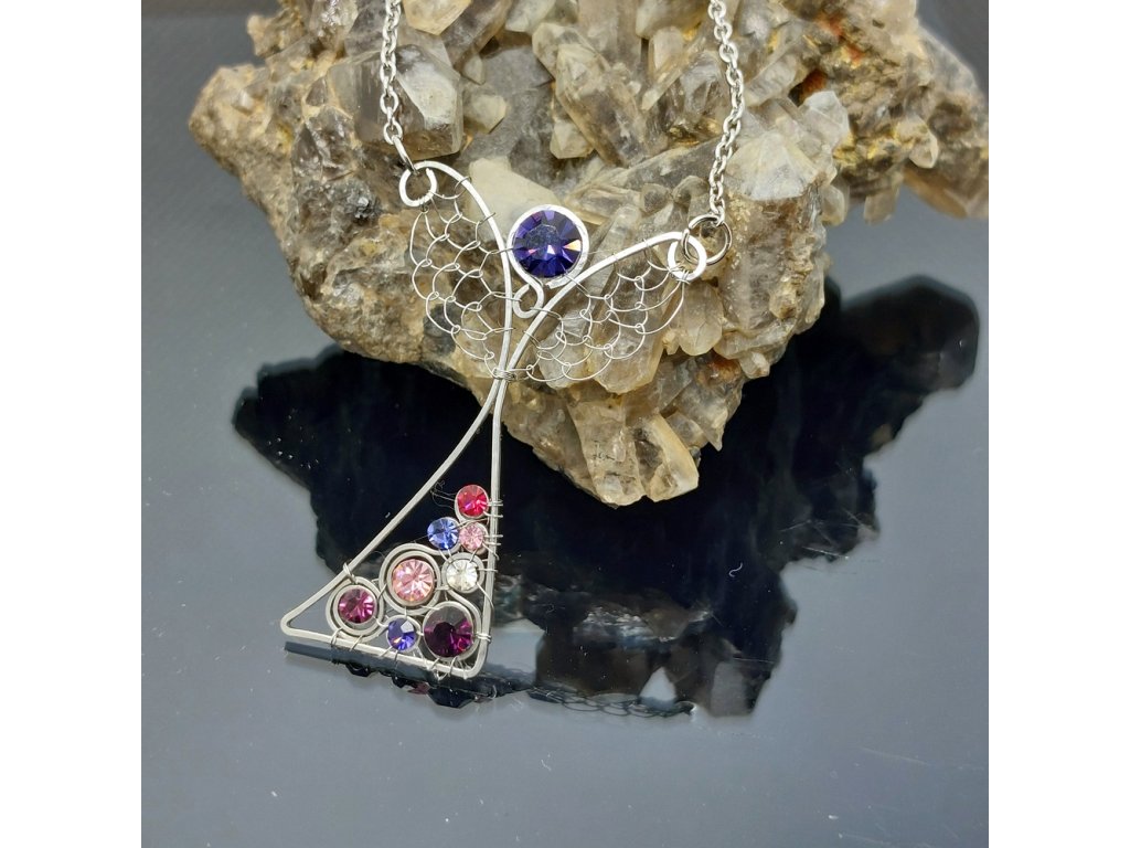 Jemně utkaný a tepaný, roztančený anděl zdobený třpytivými kamínky swarovski, laděný do fialova.