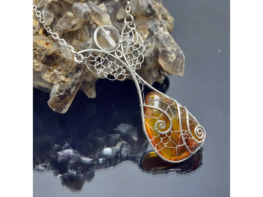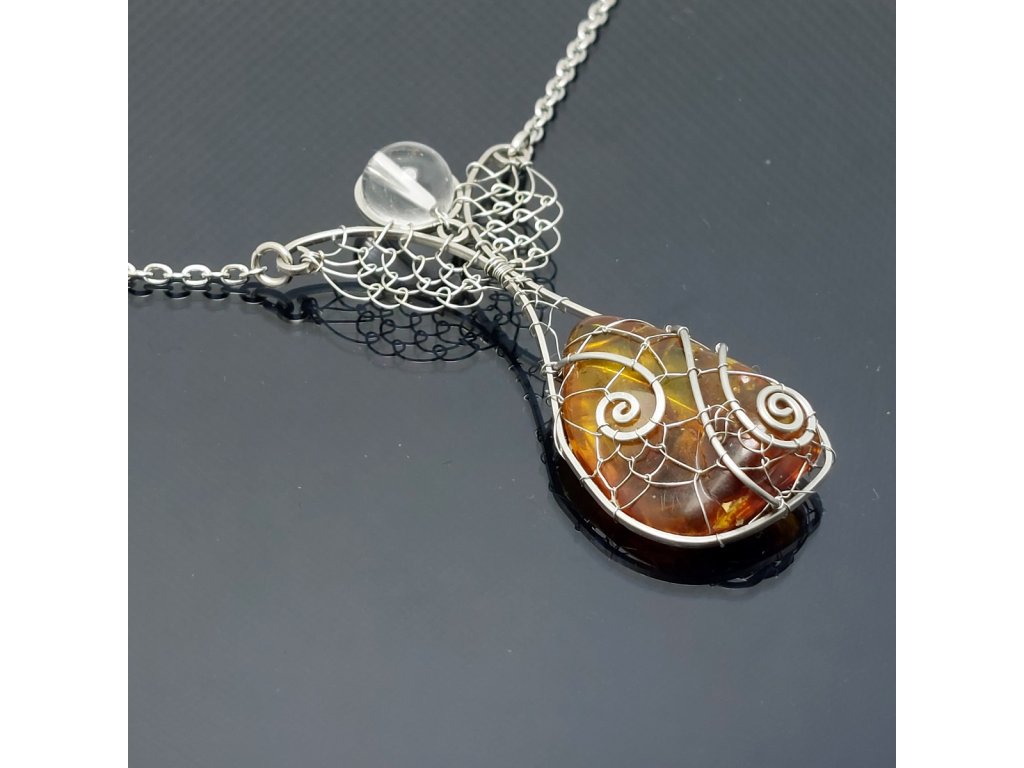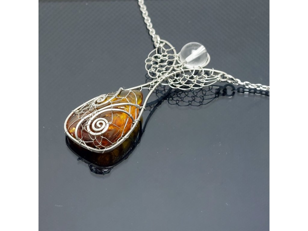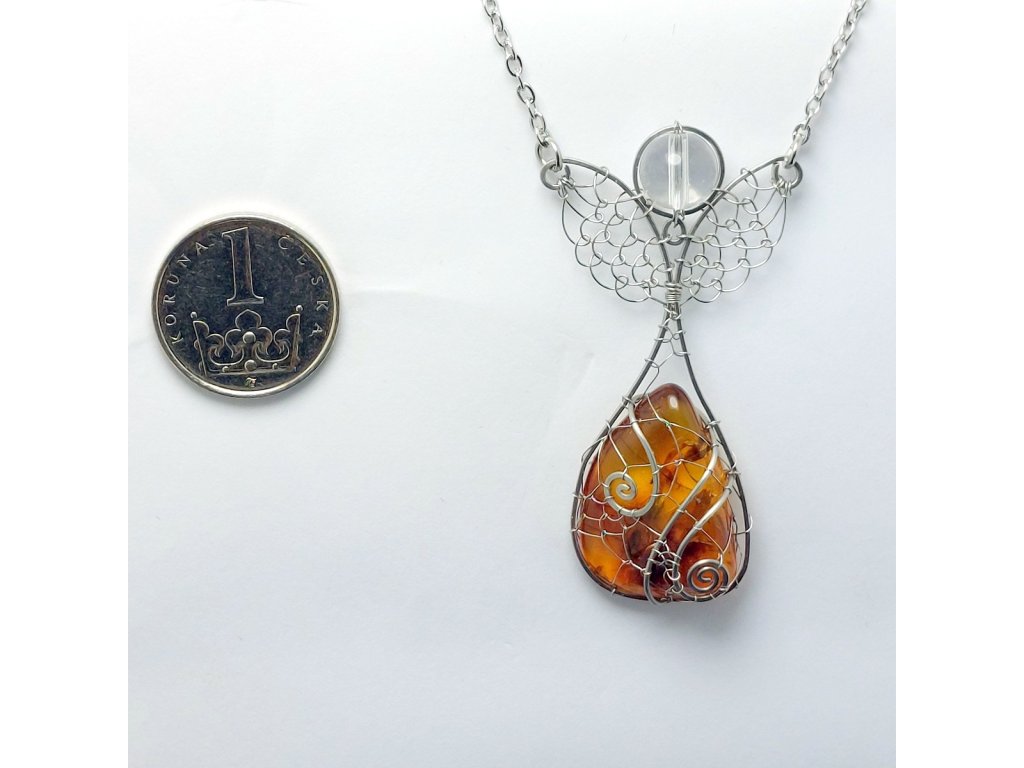 náhrdelník ve tvaru anděla zhotovený kombinací technik tepání a drátování z chirurgické oceli s křišťálem (hlava) a jantarem (tělo)
