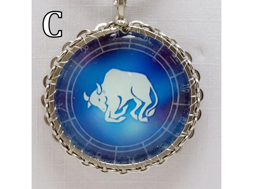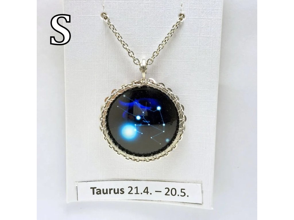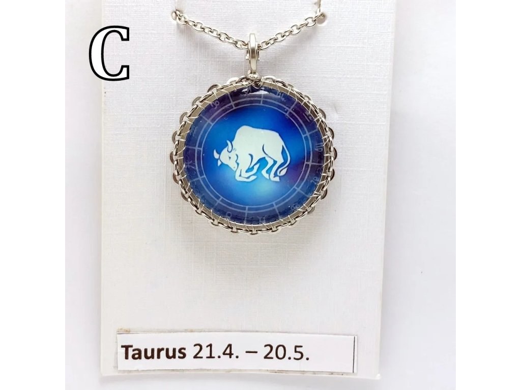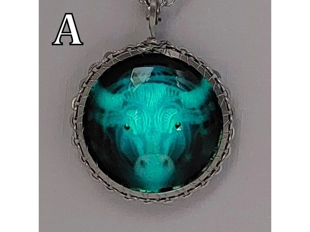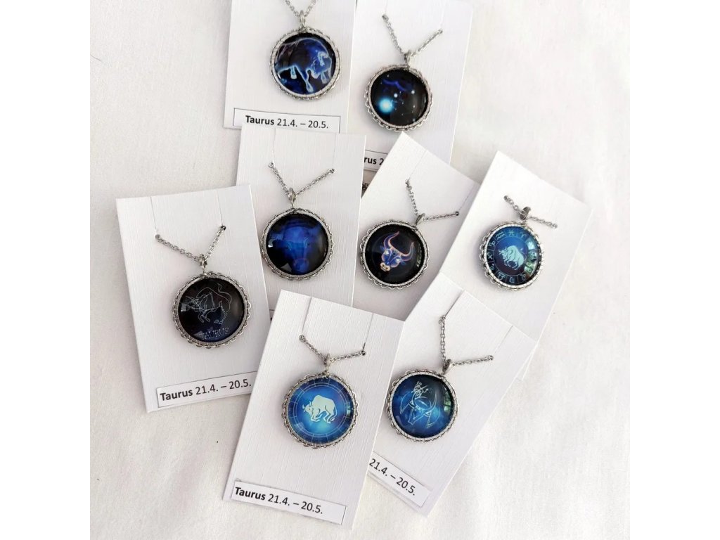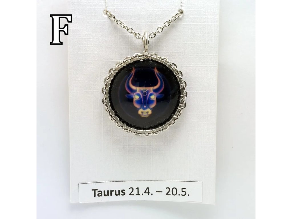 Unisex náhrdelník se zakomponovanou skleněnou čočkou ( průměr 2,5 cm) s motivem znamení Býka, zavěšený na řetízku (délka 50 cm, lze na požádání změnit).