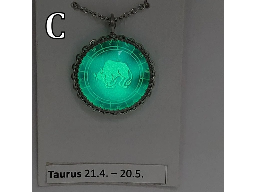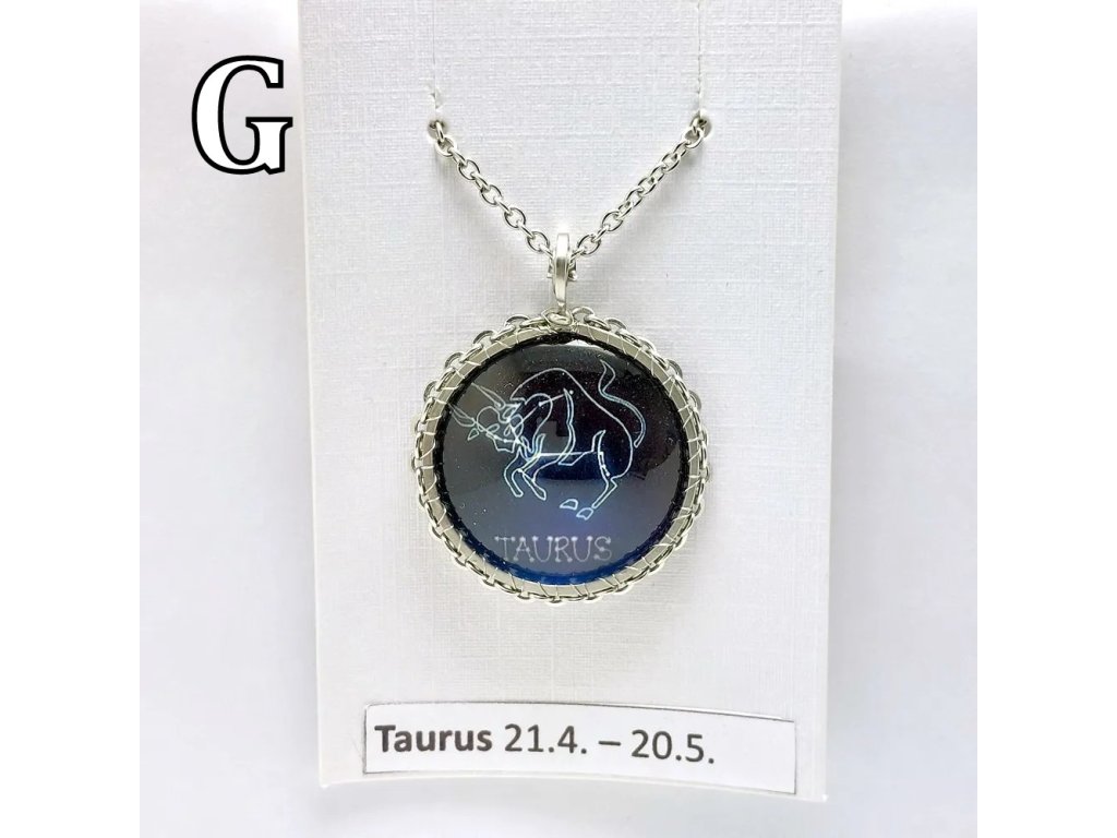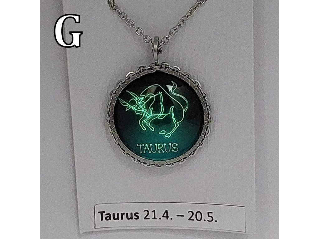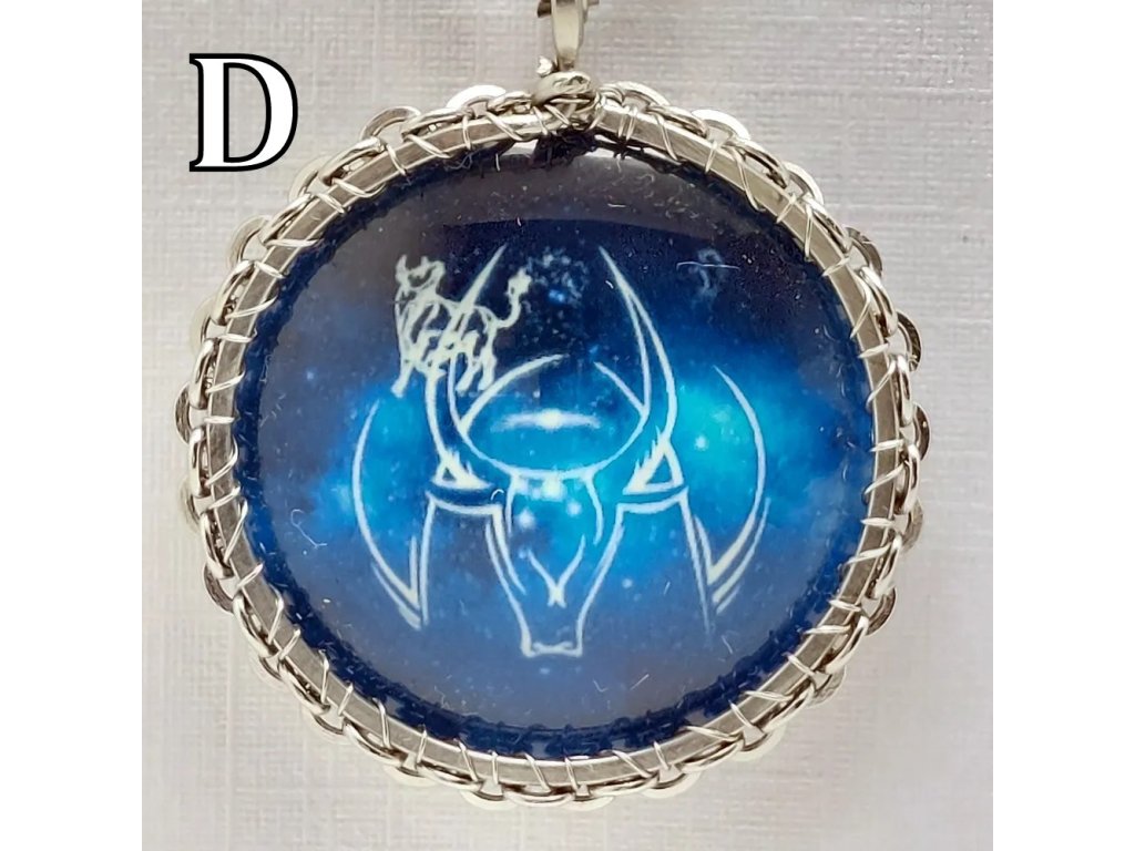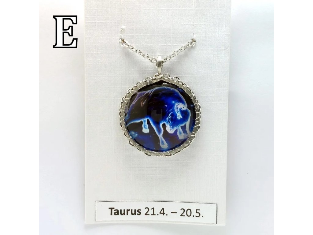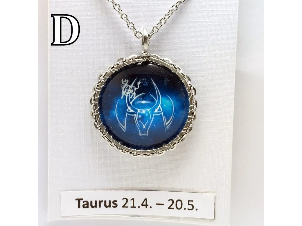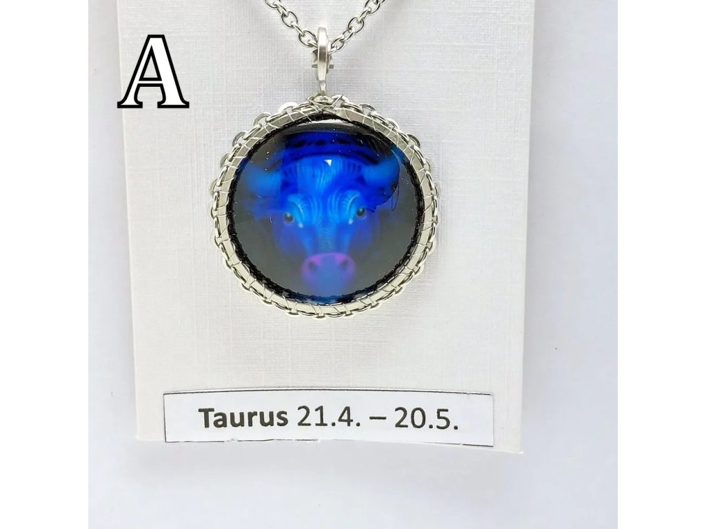 Unisex náhrdelník se zakomponovanou skleněnou čočkou ( průměr 2,5 cm) s motivem znamení Býka, zavěšený na řetízku (délka 50 cm, lze na požádání změnit).