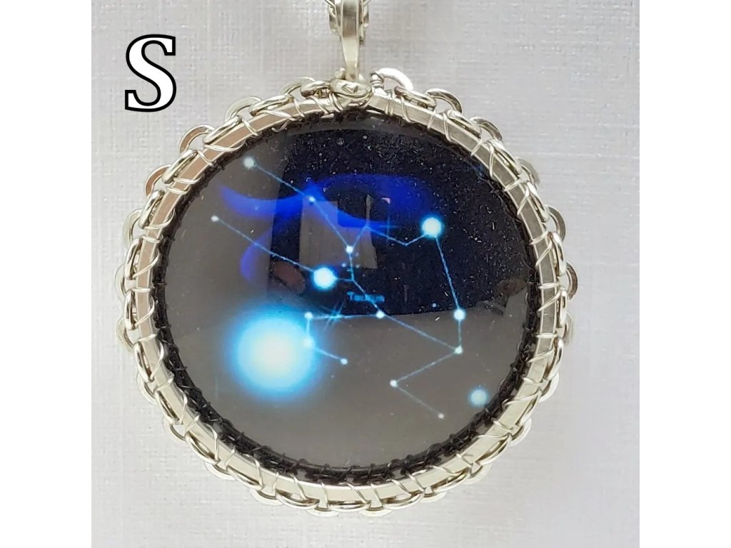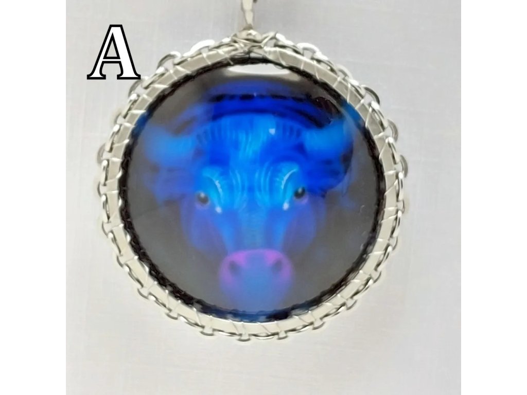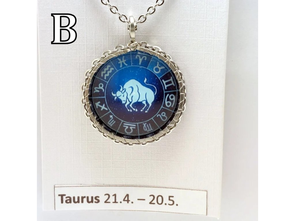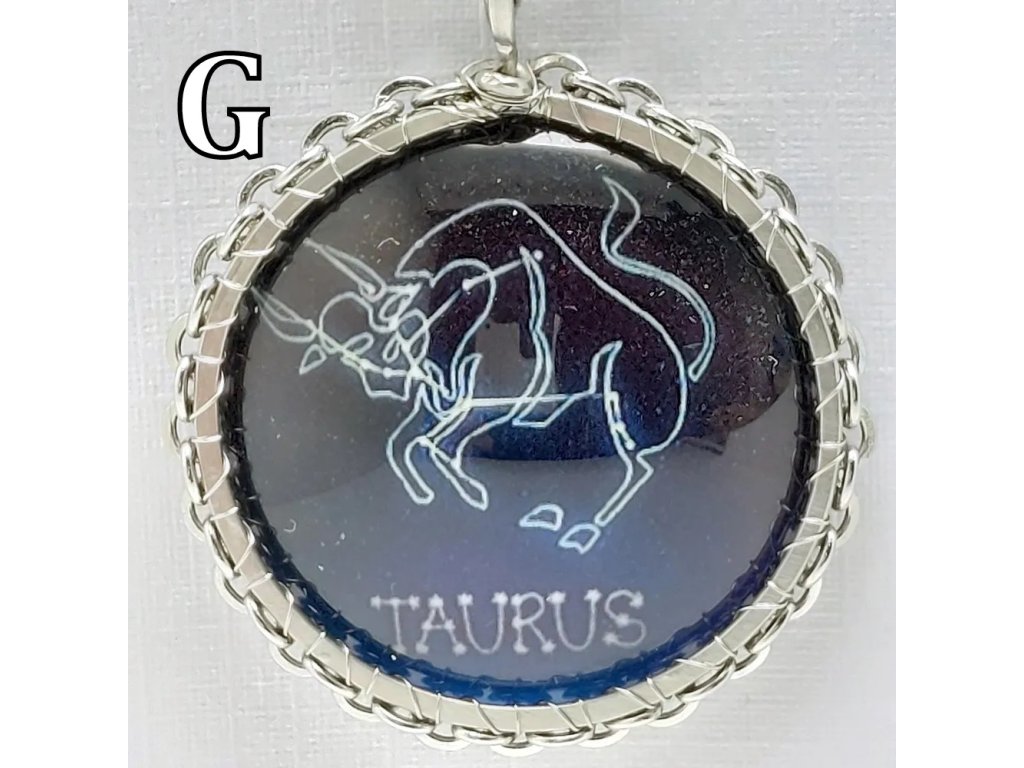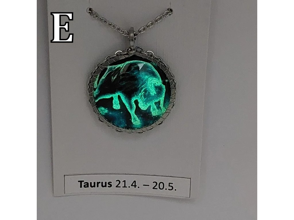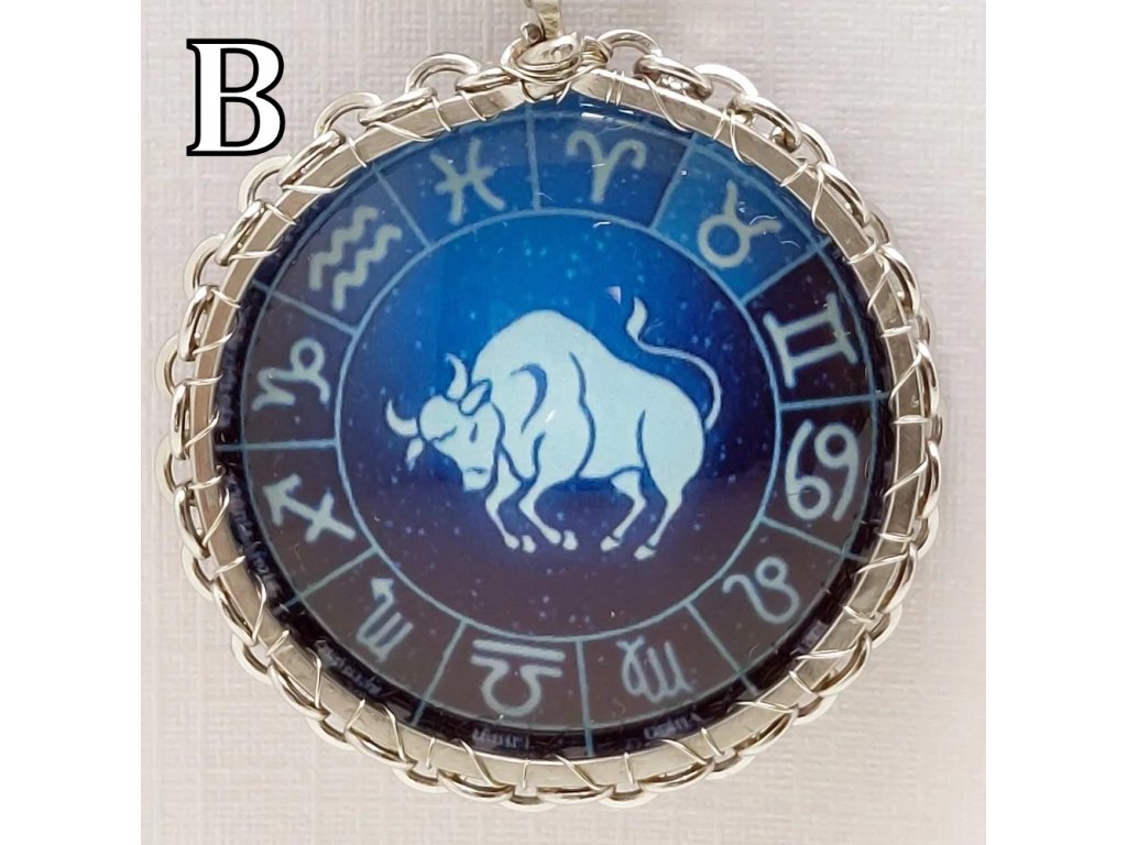 Unisex náhrdelník se zakomponovanou skleněnou čočkou ( průměr 2,5 cm) s motivem znamení Býka, zavěšený na řetízku (délka 50 cm, lze na požádání změnit).