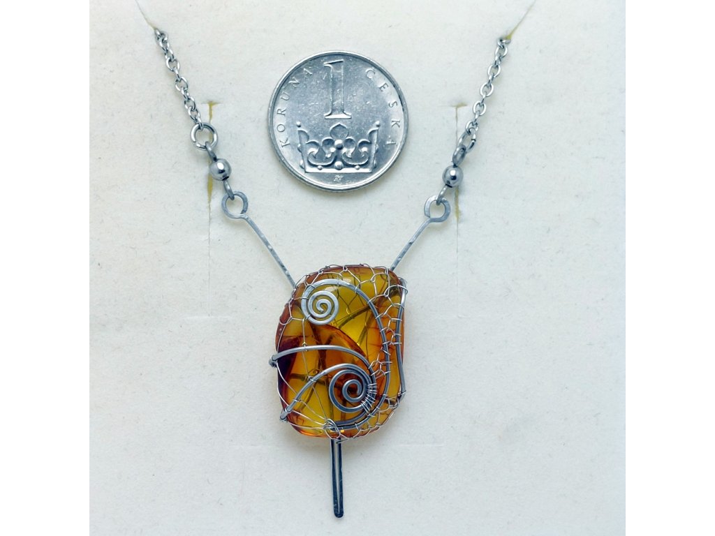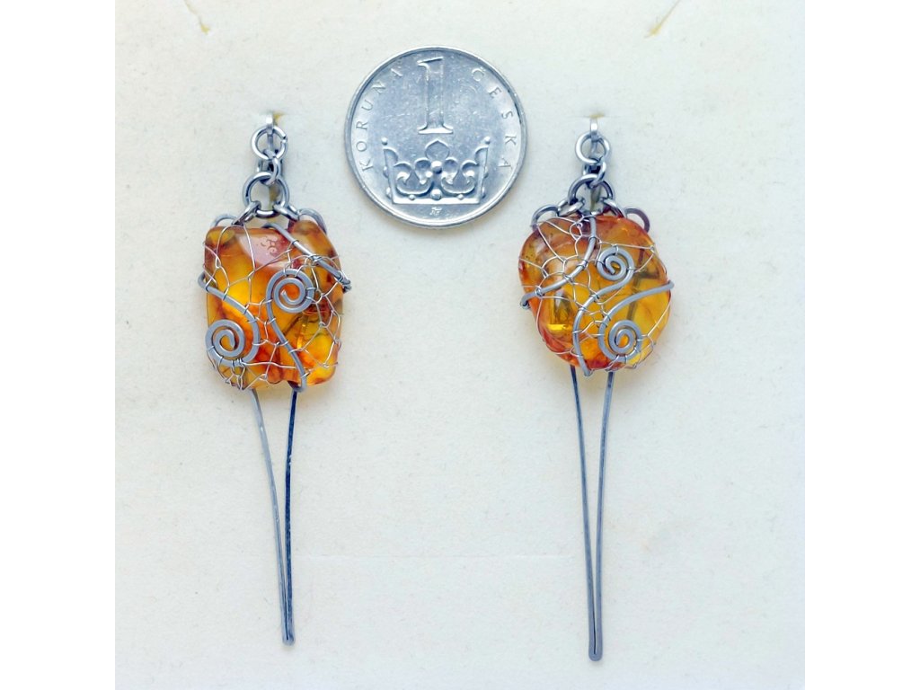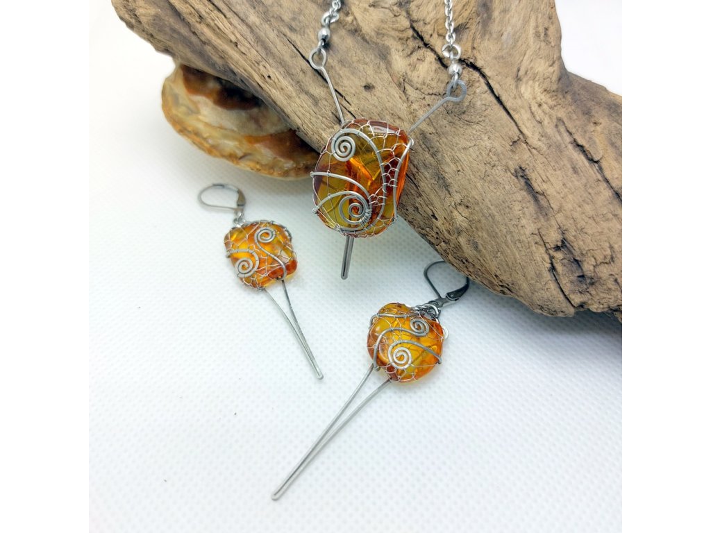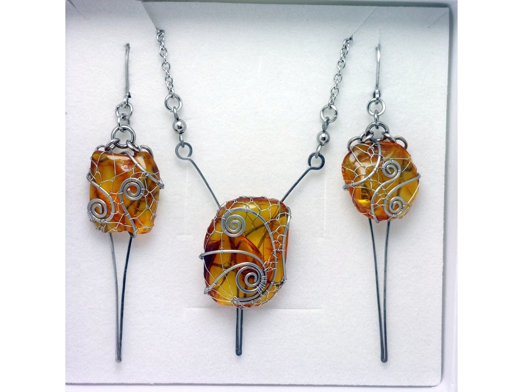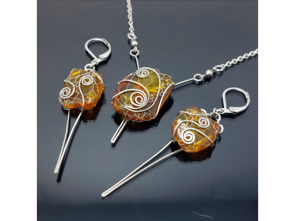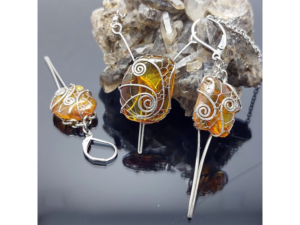 Základ tvoří nádherné kousky čirého jantaru. Protože se nejedná o minerál v pravém slova smyslu, jsou šperky z jantaru velmi lehoučké a zejména u náušnic příjemné na nošení.
