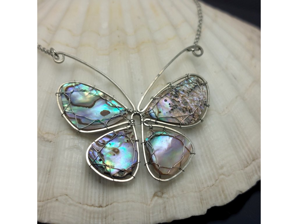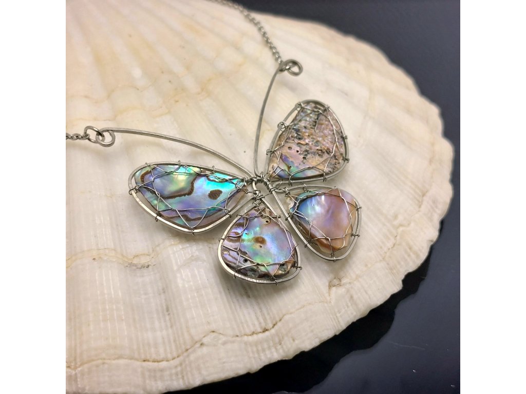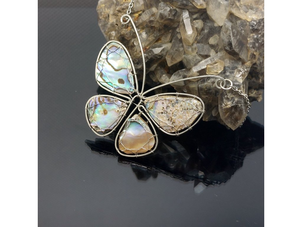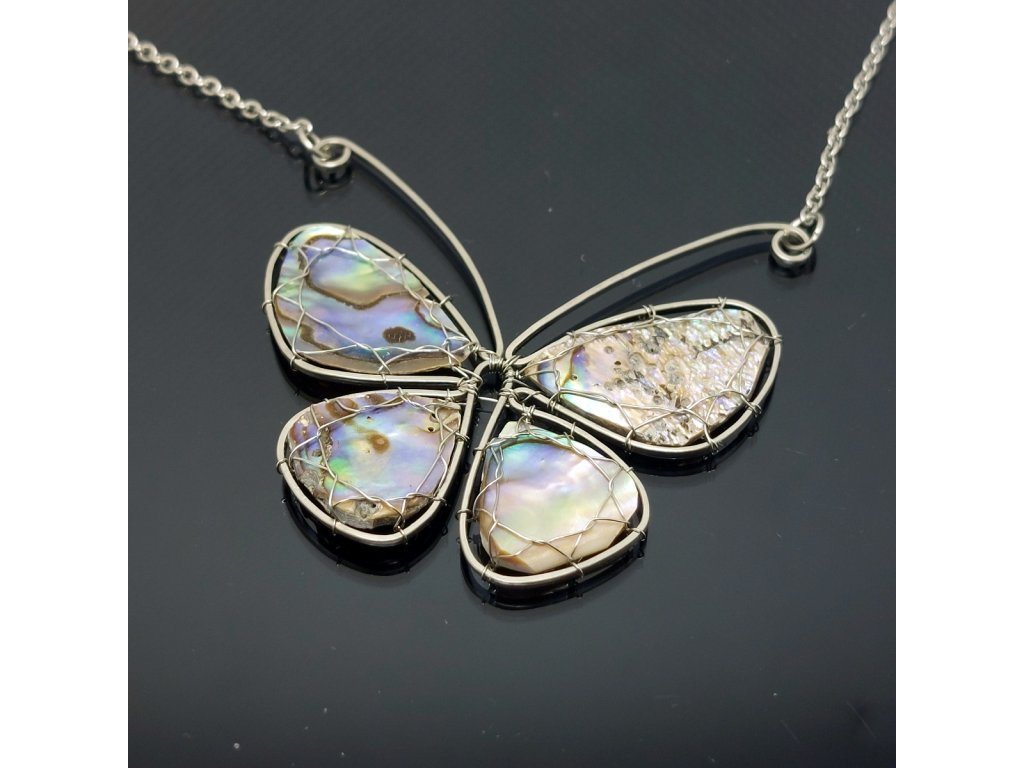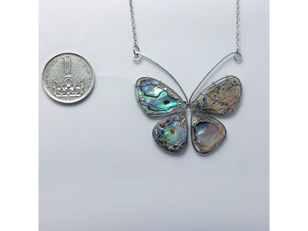 Jak už název napovídá, v jeho křídlech se leskne perleť Paua, která je jemně ovinutá drátky z chirurgické oceli. Kostra motýla je tepaná ze silnějšího drátu (0,8mm), takže je poměrně solidní a dobře drží tvar.