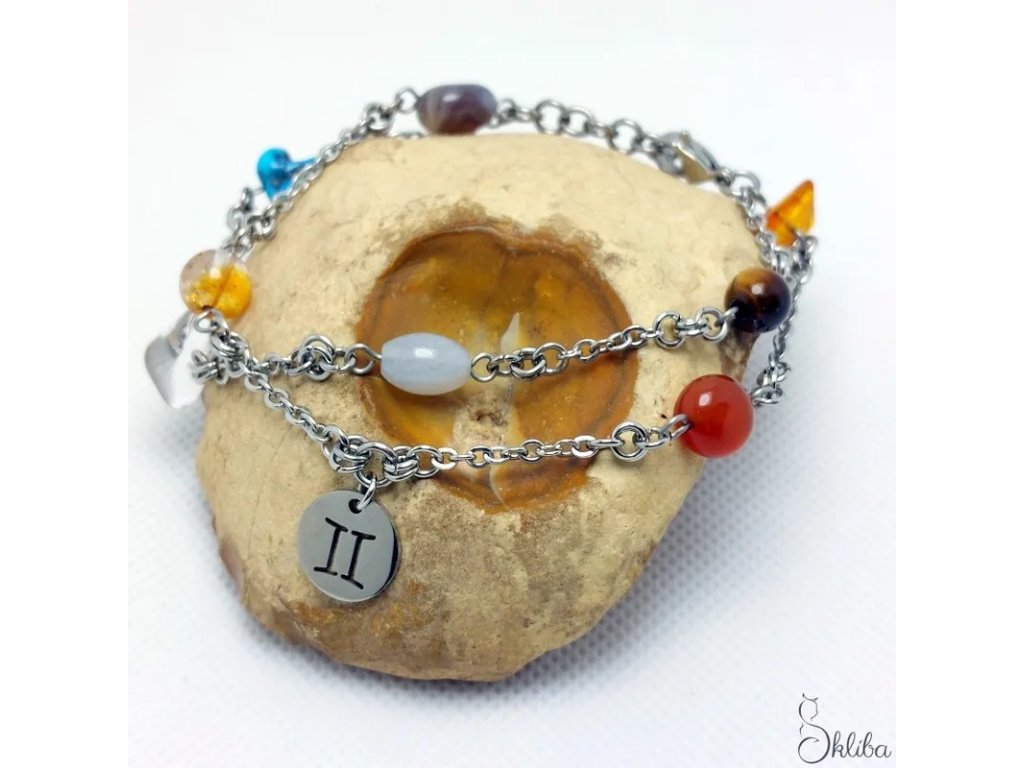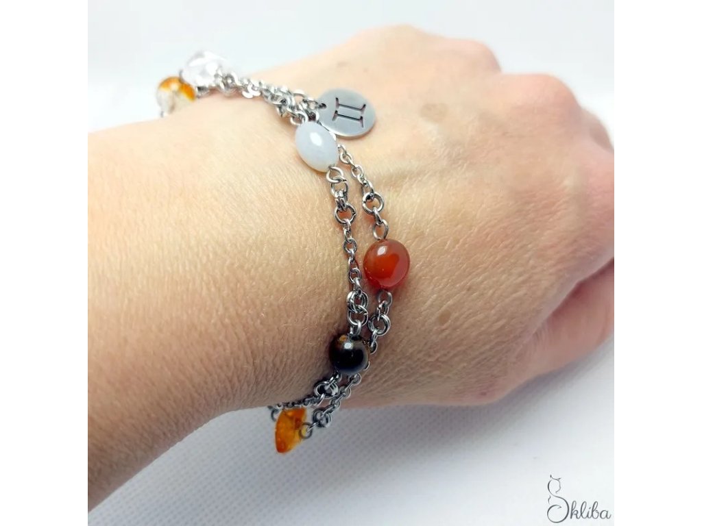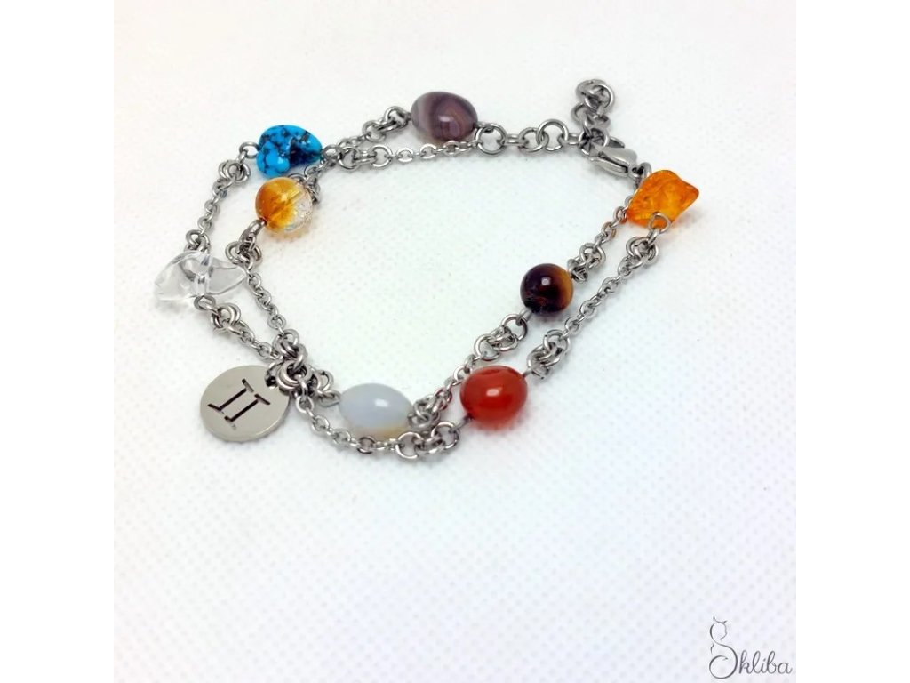 Velikostně nastavitelný náramek z chirurgické oceli s přívěskem s motivem znamení Blíženců doplněný 8 polodrahokamy hodícími se k tomuto znamení. Délka náramku: 18-22 cm (lze prodloužit na požádání)