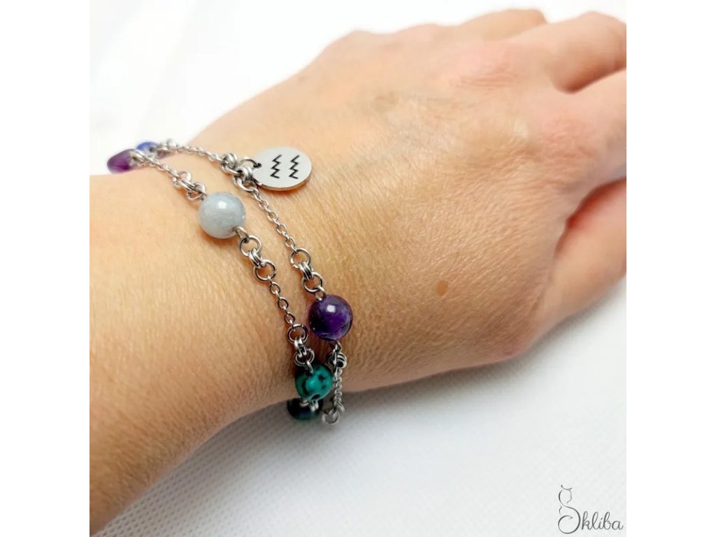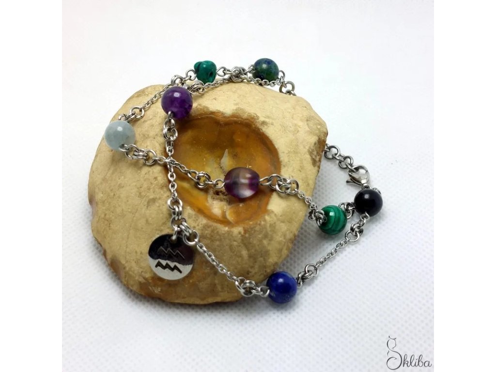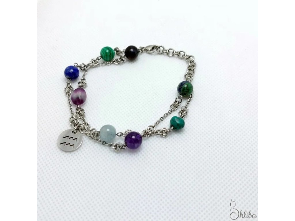 Velikostně nastavitelný náramek z chirurgické oceli s přívěskem s motivem znamení Vodnáře doplněný 8 polodrahokamy hodícími se k tomuto znamení.