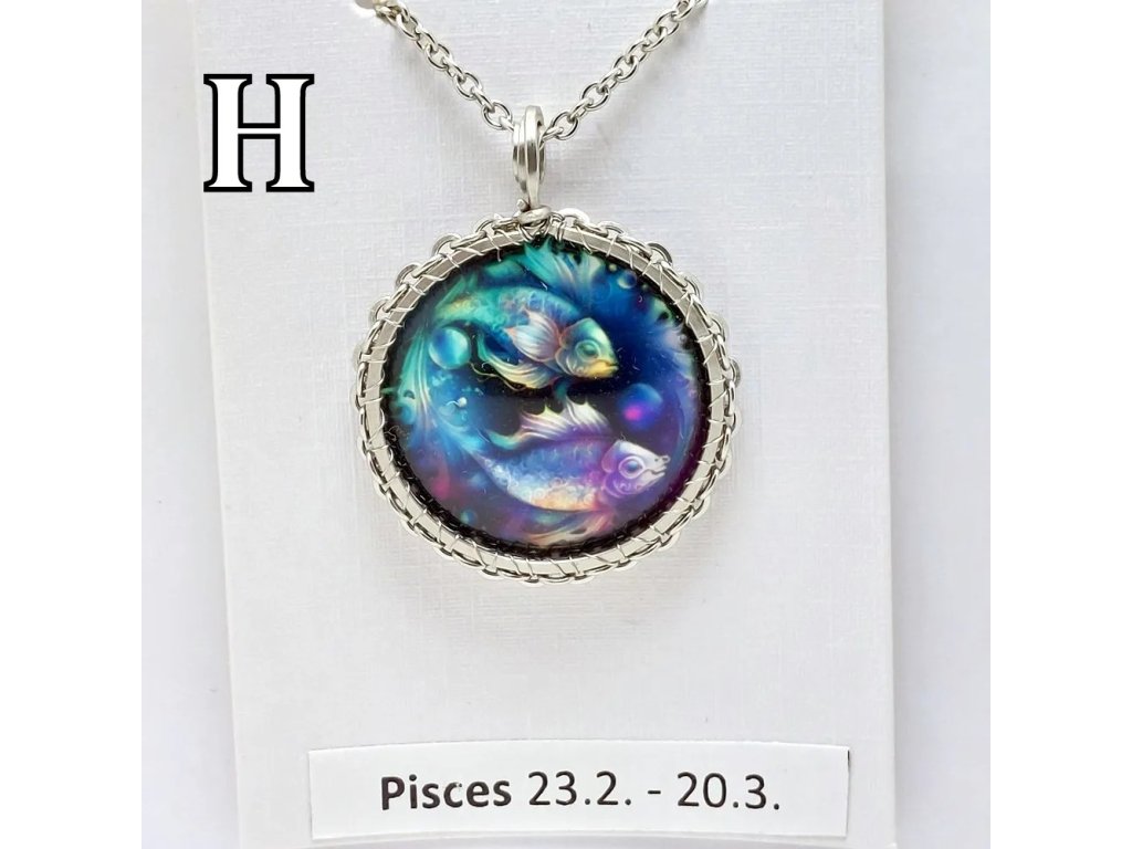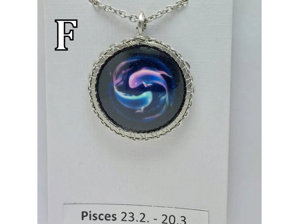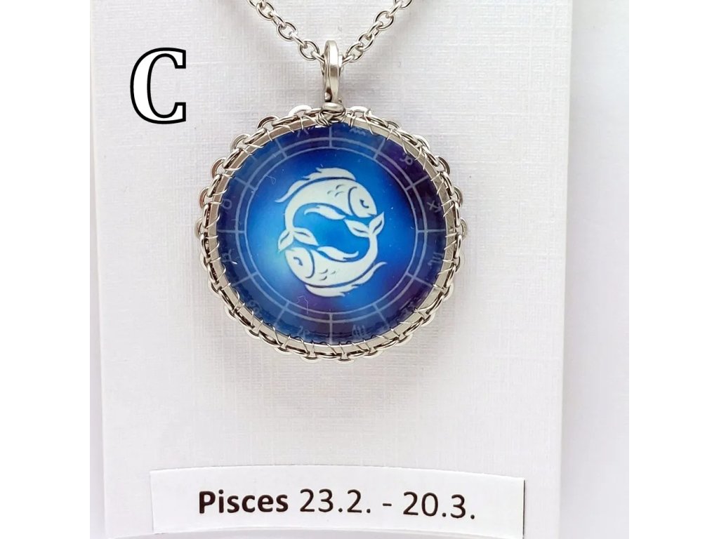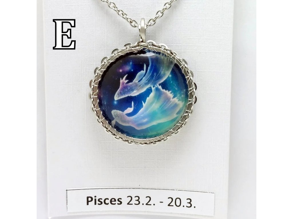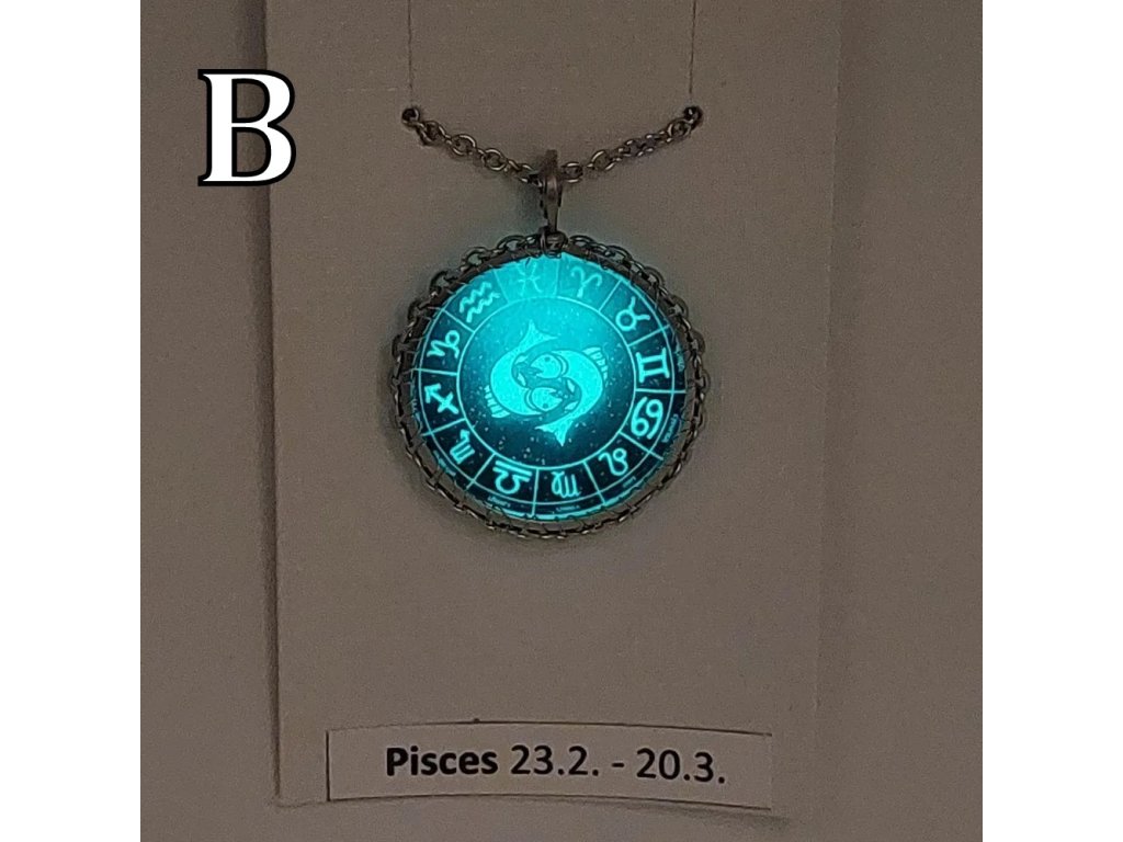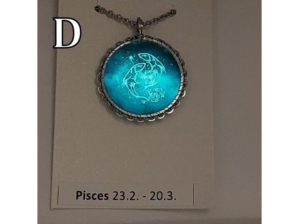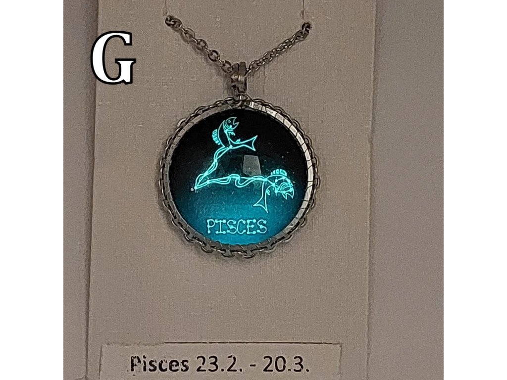Unisex náhrdelník se zakomponovanou skleněnou čočkou ( průměr 2,5 cm) s motivem znamení Ryb, zavěšený na řetízku (délka 50 cm, lze na požádání změnit); fluorescentní (svítí ve tmě)