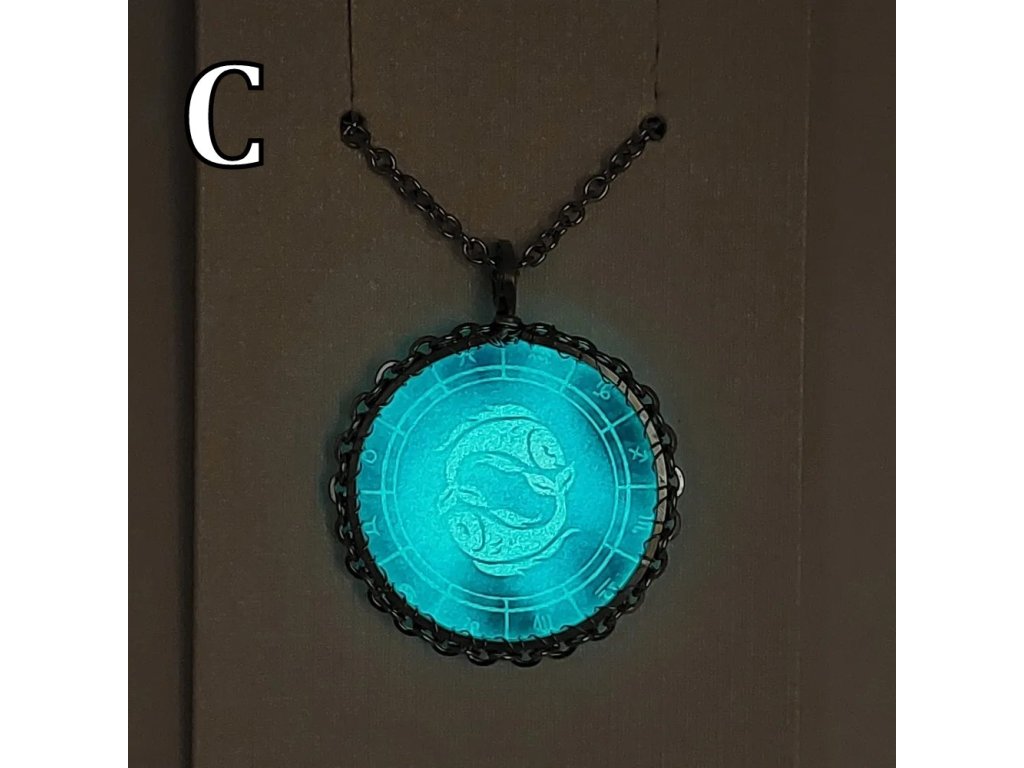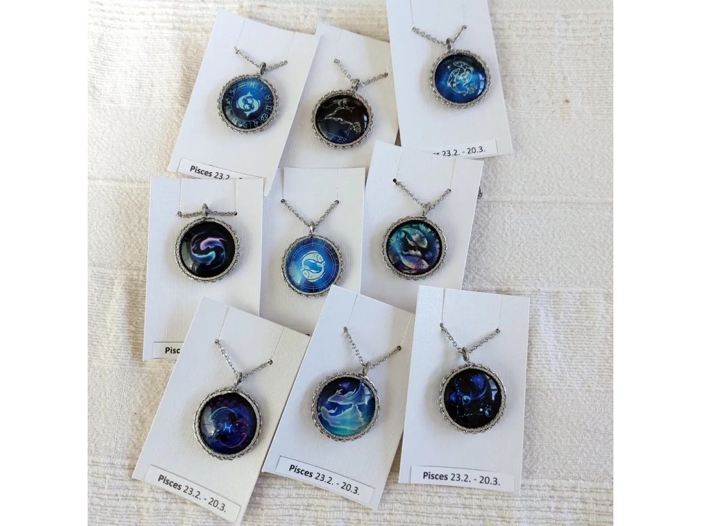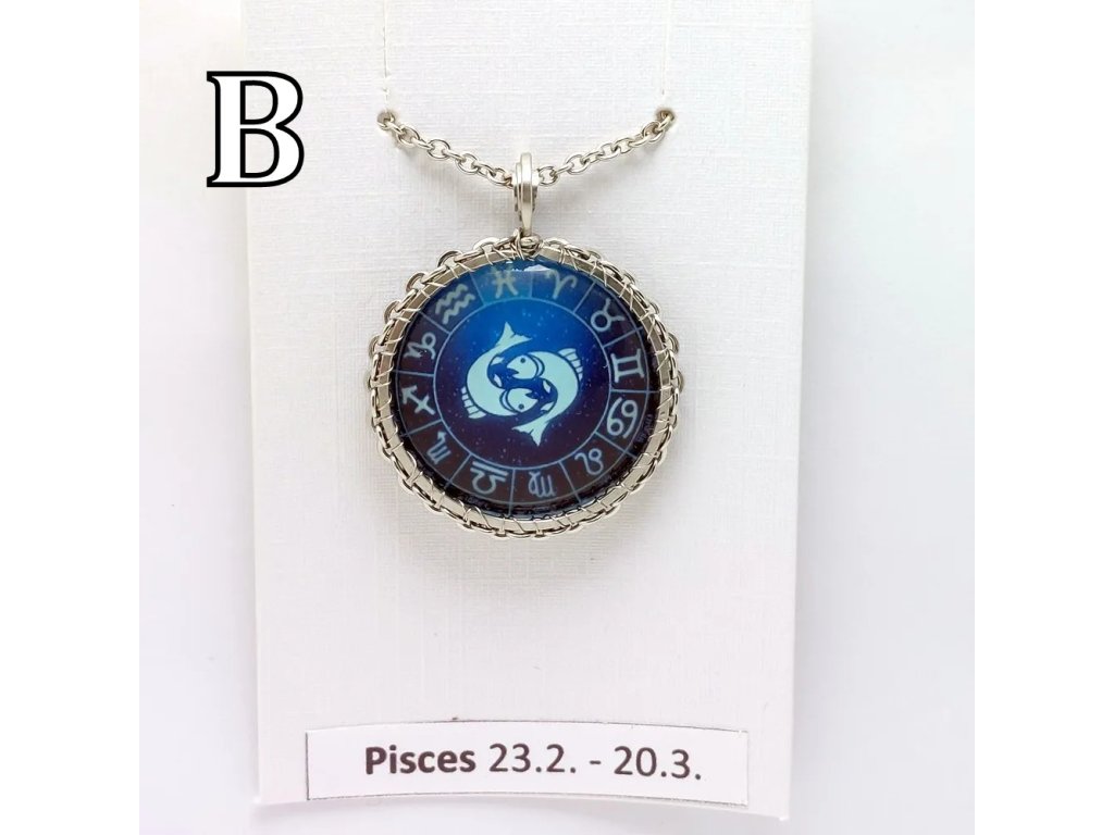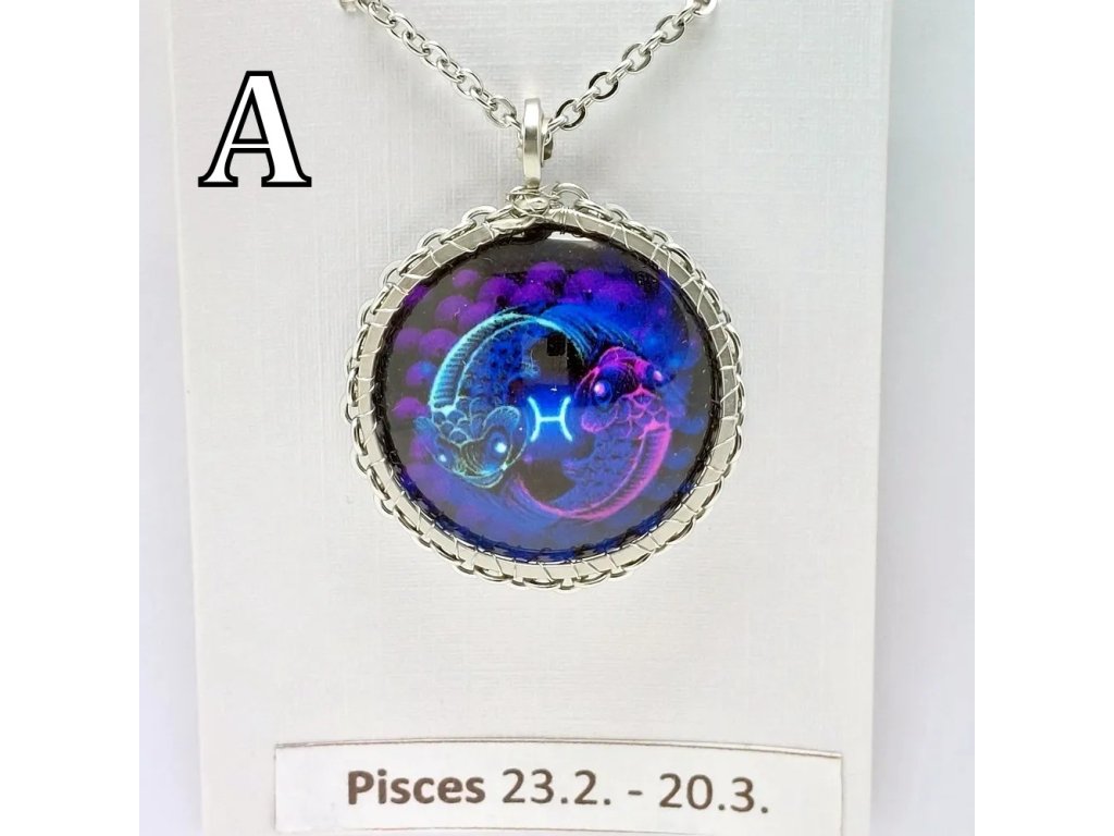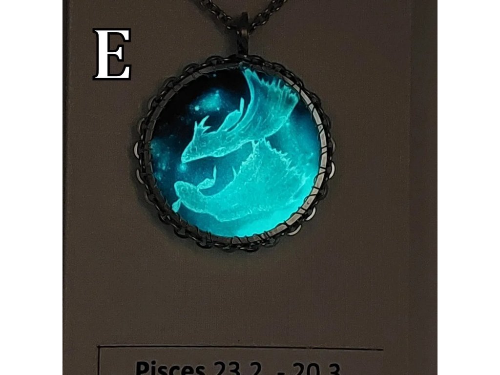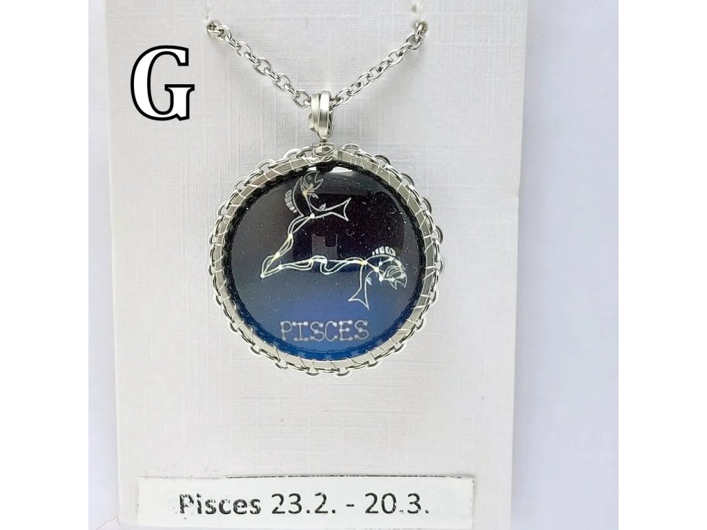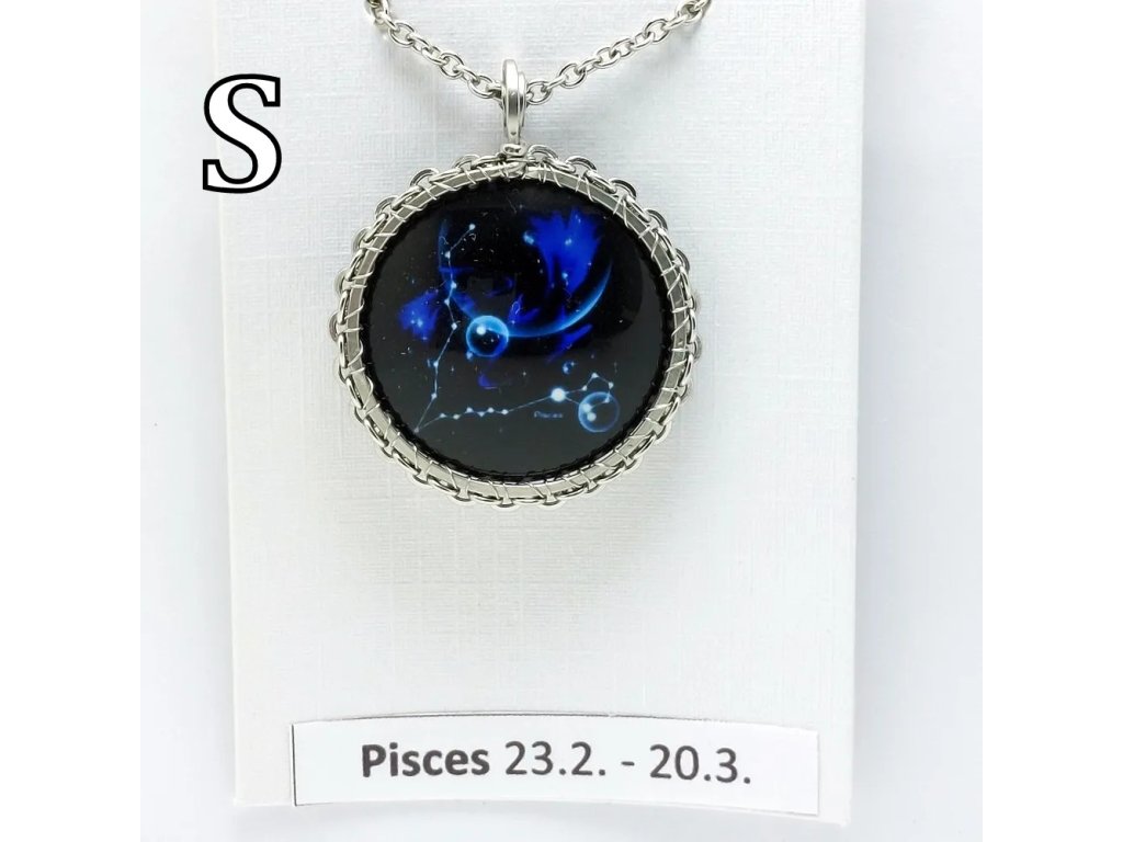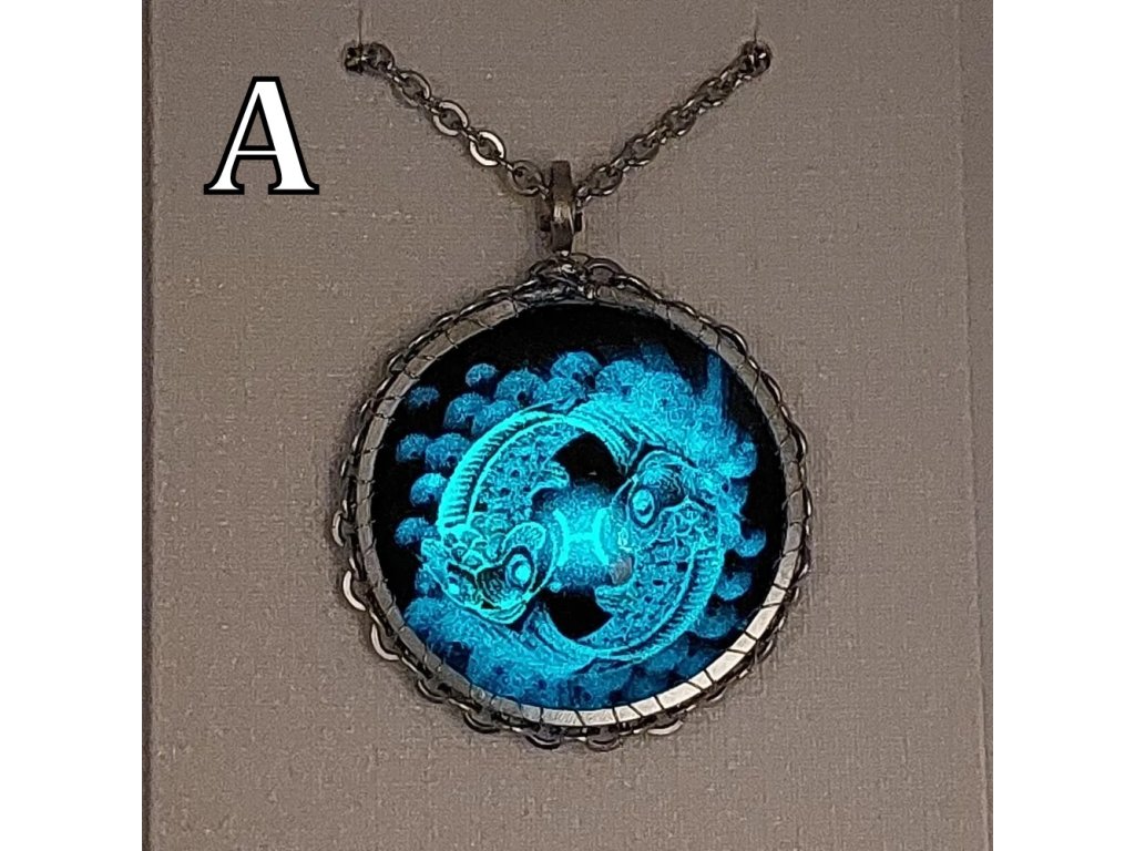 Unisex náhrdelník se zakomponovanou skleněnou čočkou ( průměr 2,5 cm) s motivem znamení Ryb, zavěšený na řetízku (délka 50 cm, lze na požádání změnit); fluorescentní (svítí ve tmě)