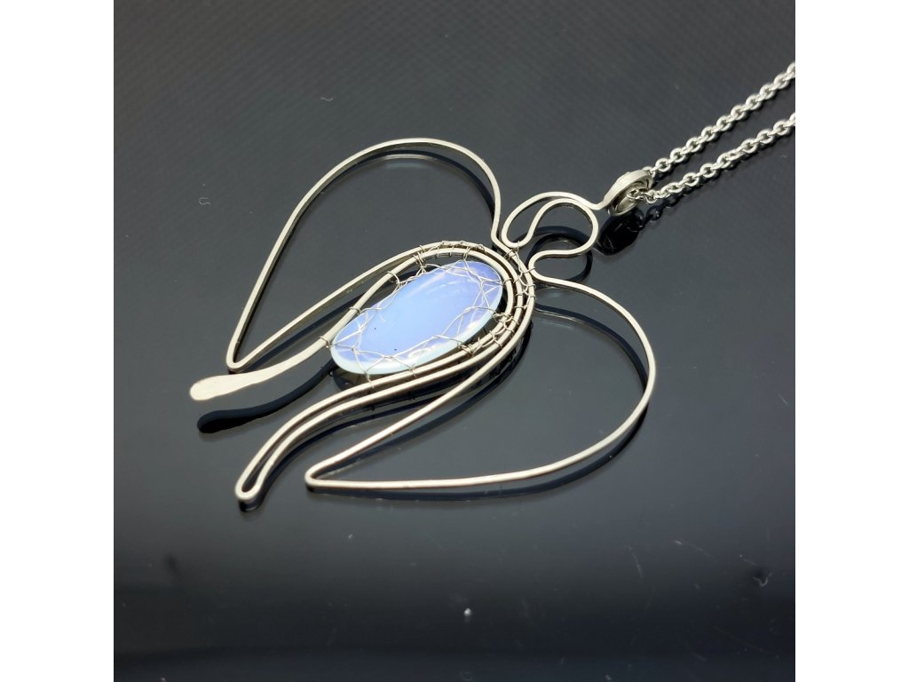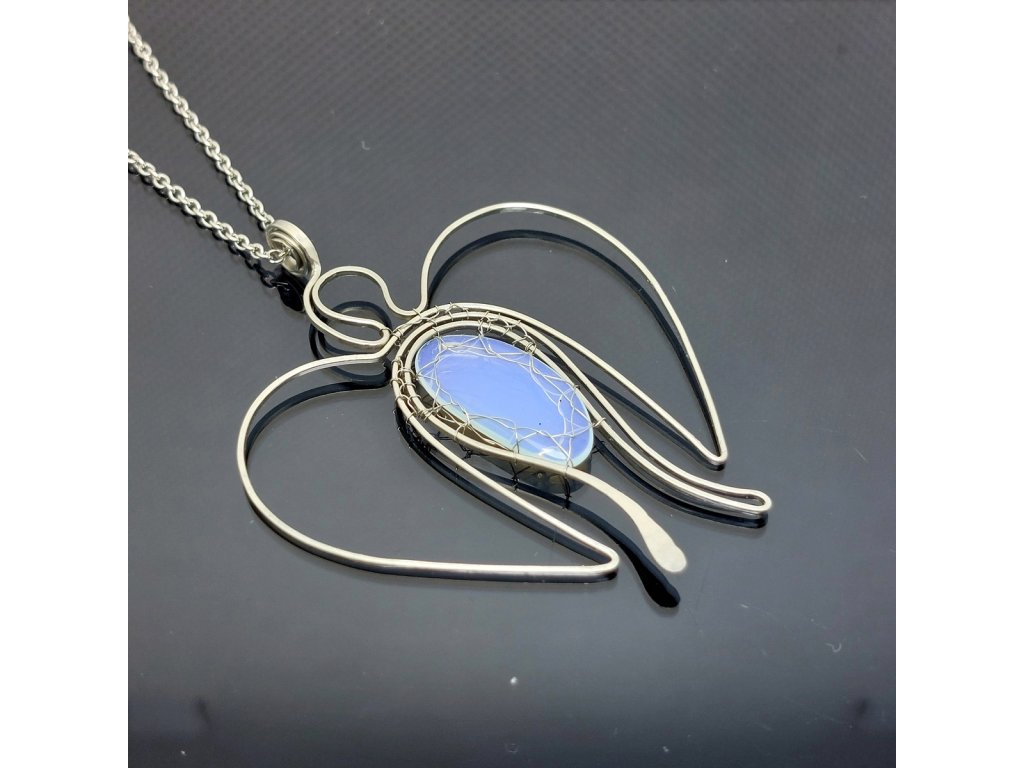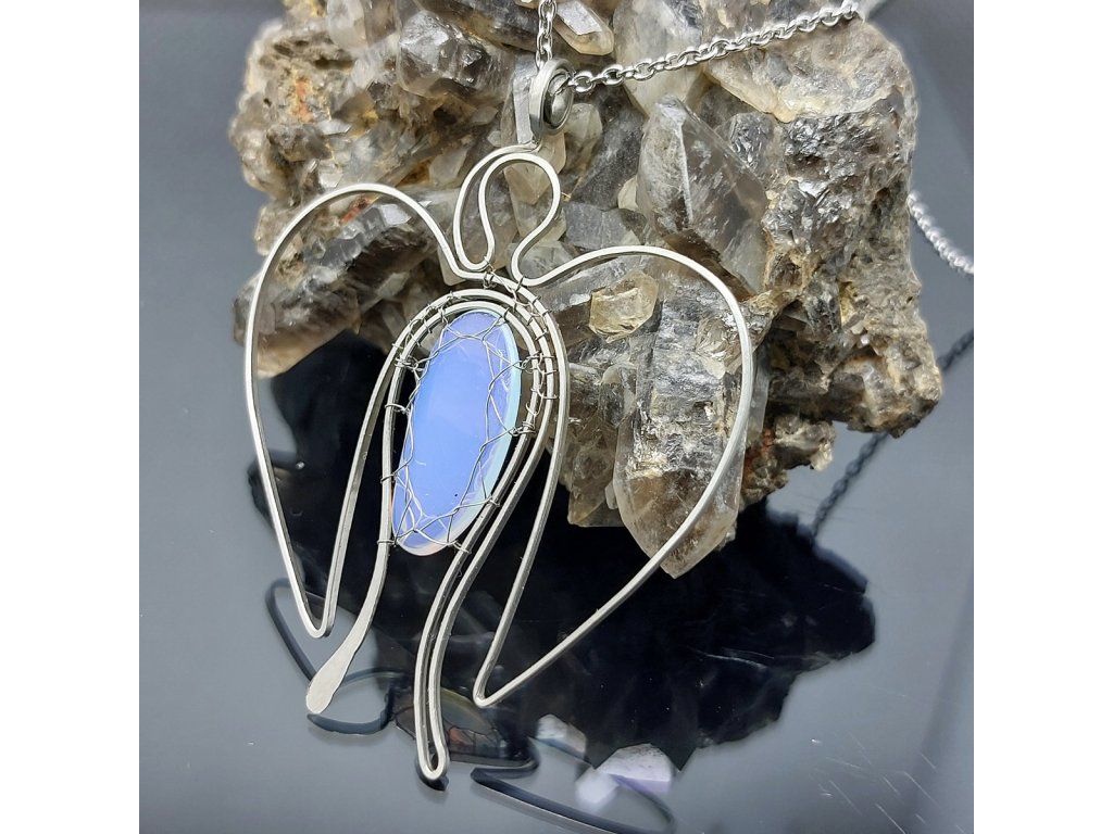 náhrdelník ve tvaru anděla zhotovený kombinací technik tepání a drátování z chirurgické oceli s opalitem