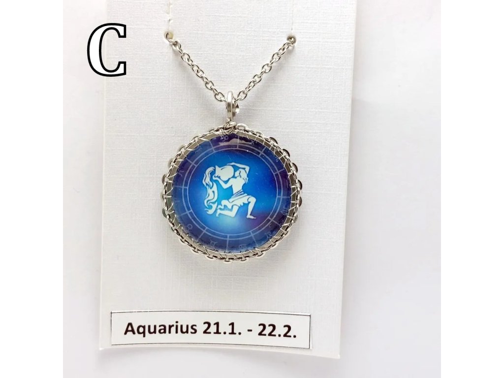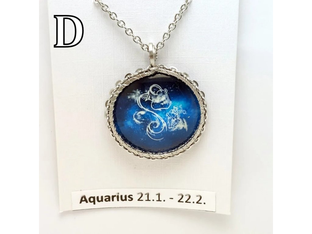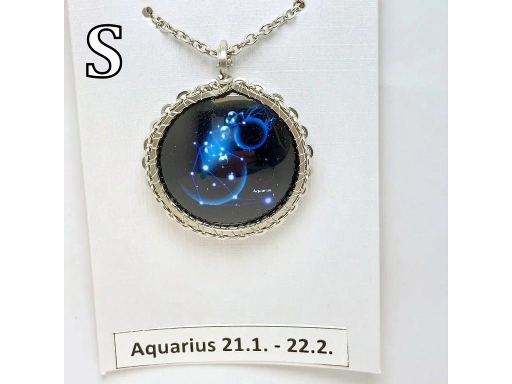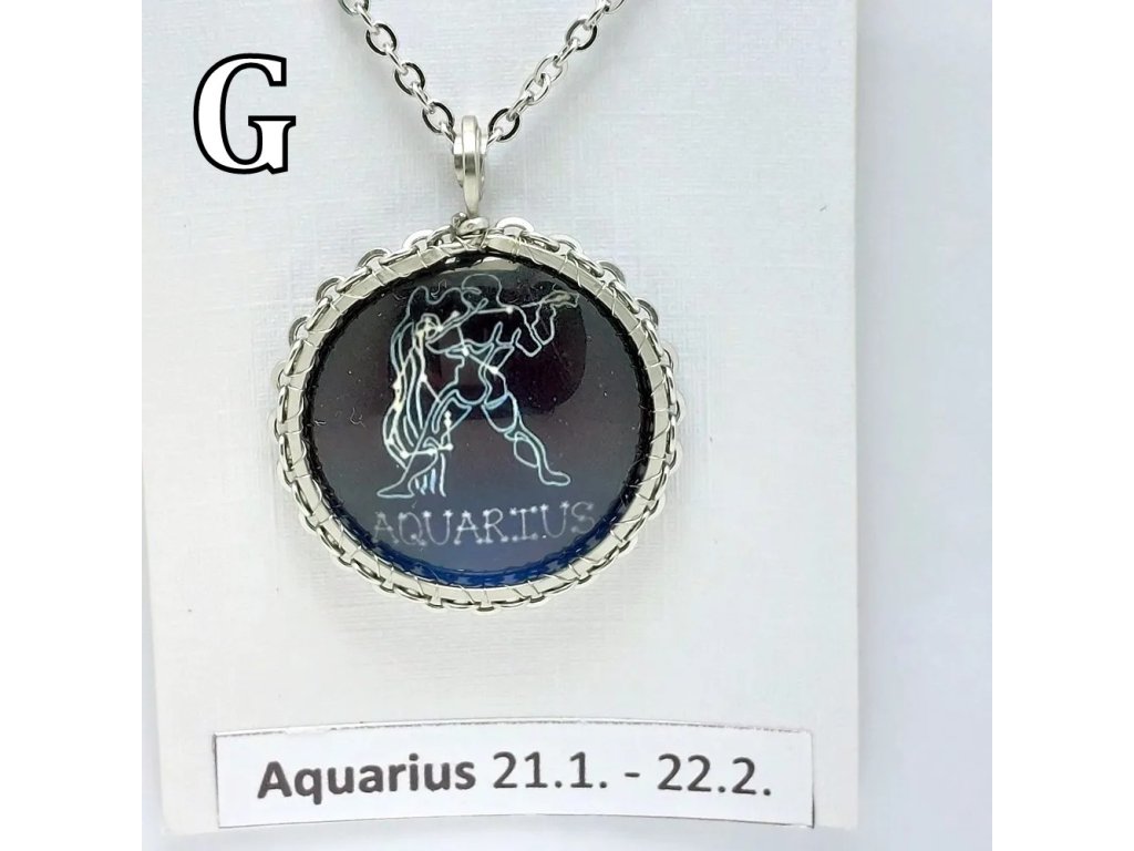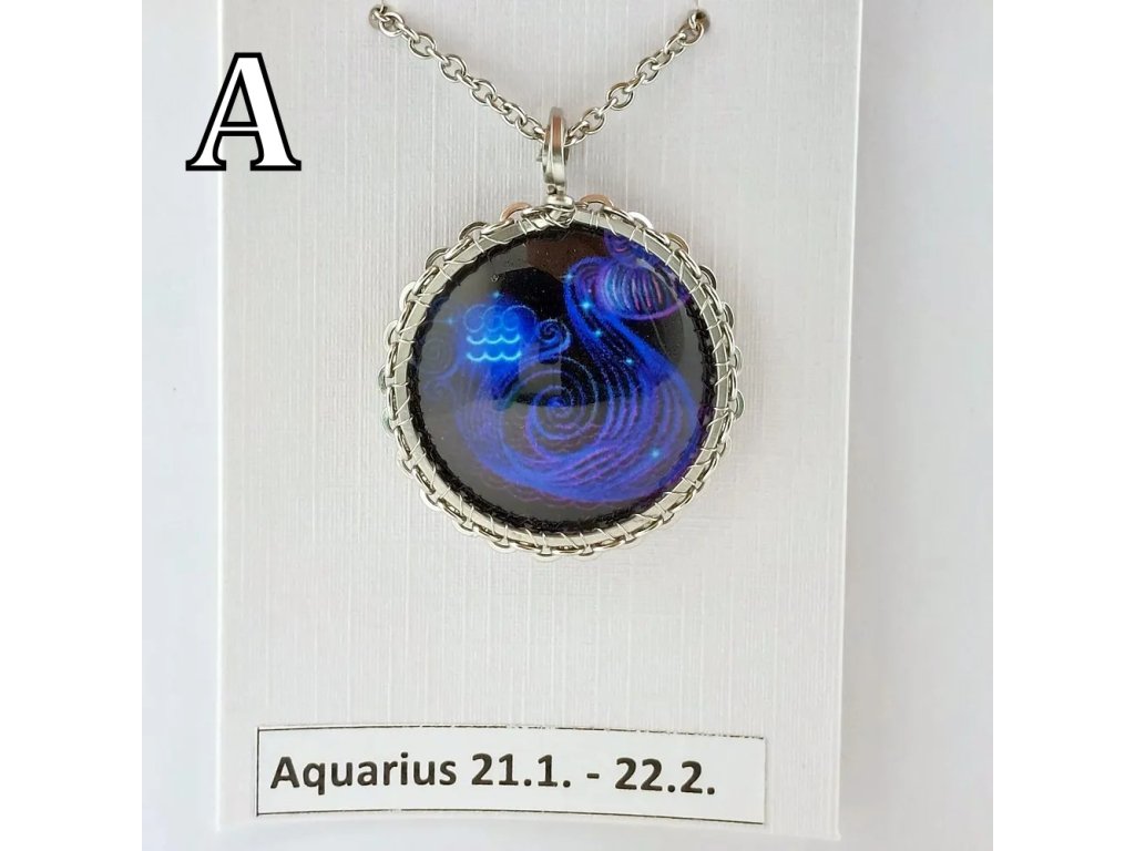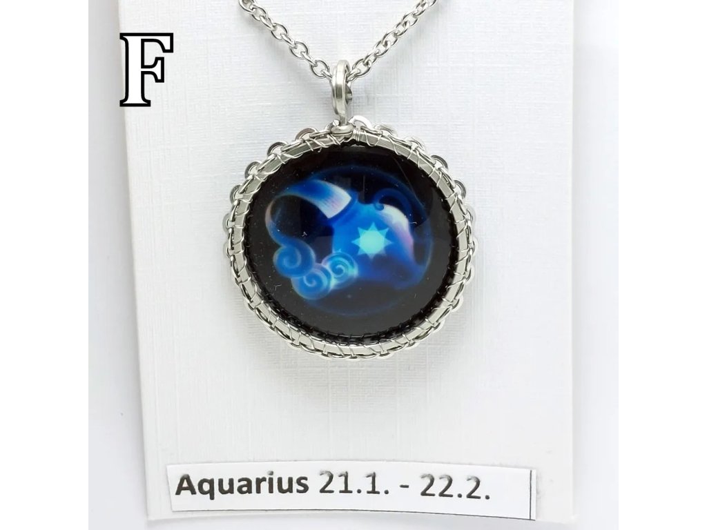 Unisex náhrdelník se zakomponovanou skleněnou čočkou ( průměr 2,5 cm) s motivem znamení Vodnáře, zavěšený na řetízku (délka 50 cm, lze na požádání změnit)
