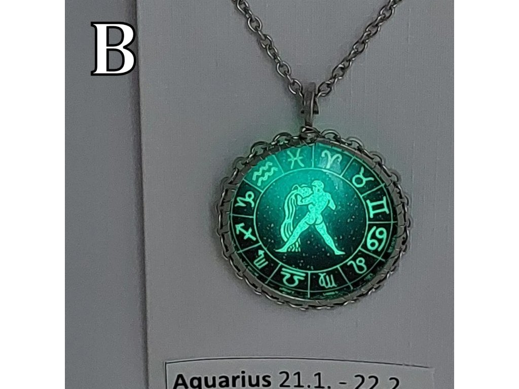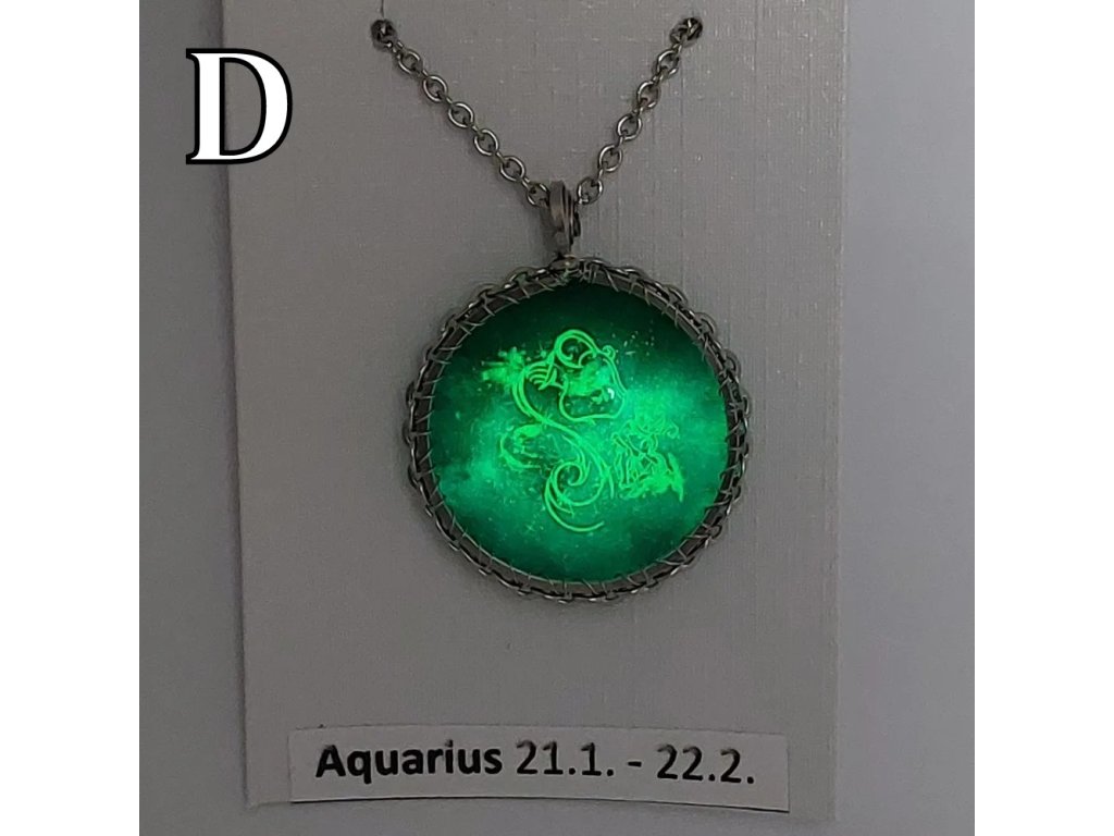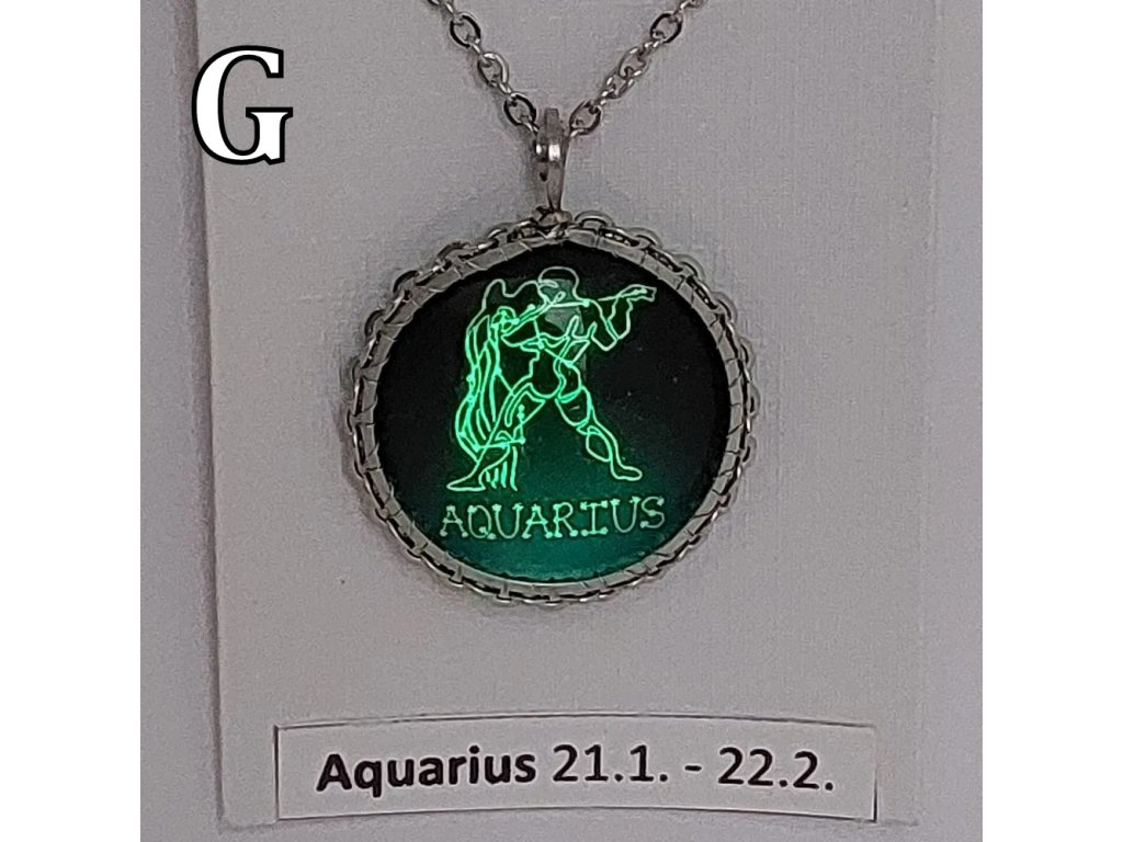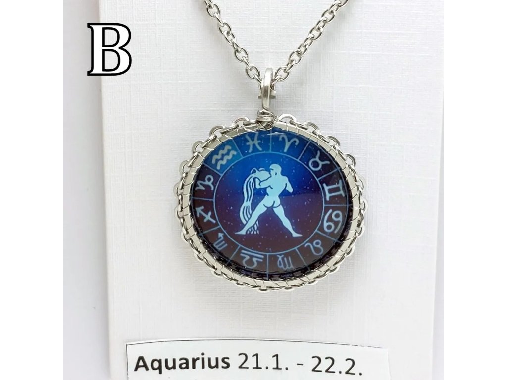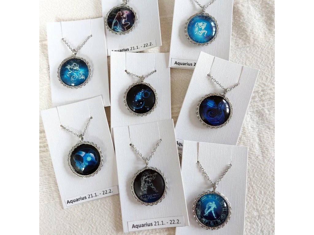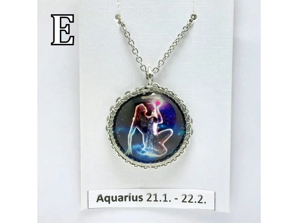 Unisex náhrdelník se zakomponovanou skleněnou čočkou ( průměr 2,5 cm) s motivem znamení Vodnáře, zavěšený na řetízku (délka 50 cm, lze na požádání změnit)