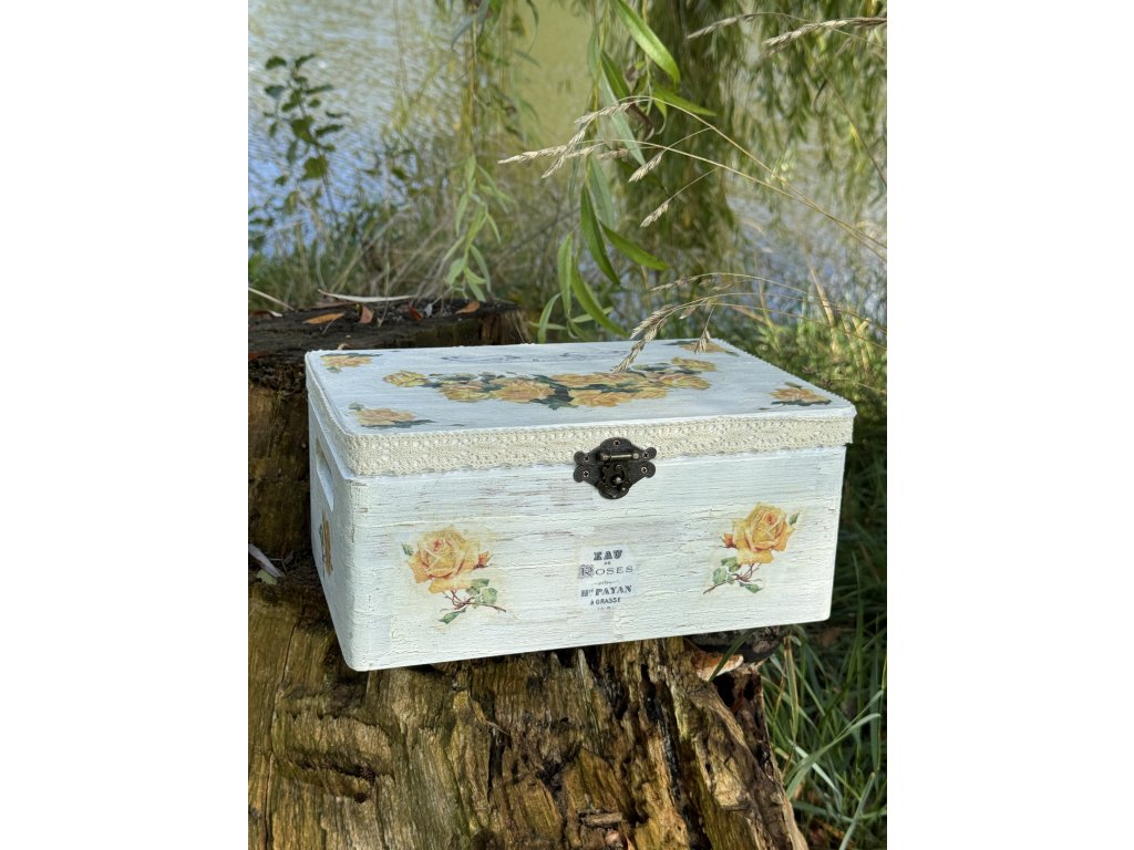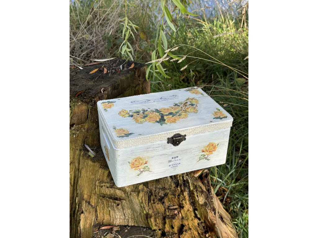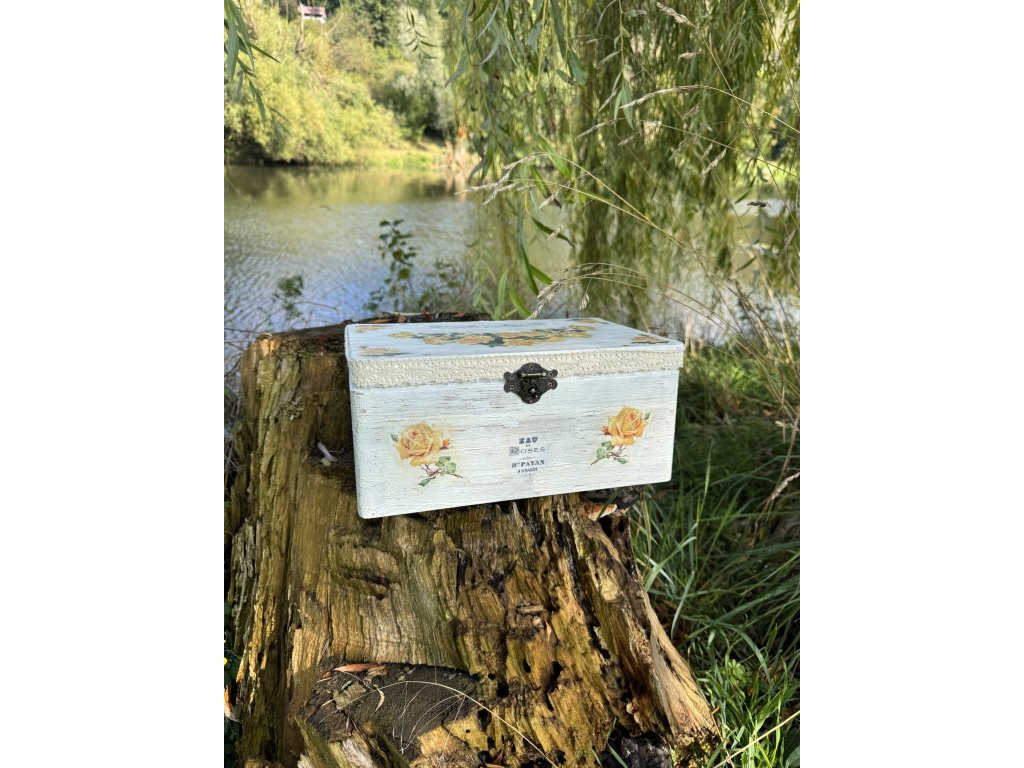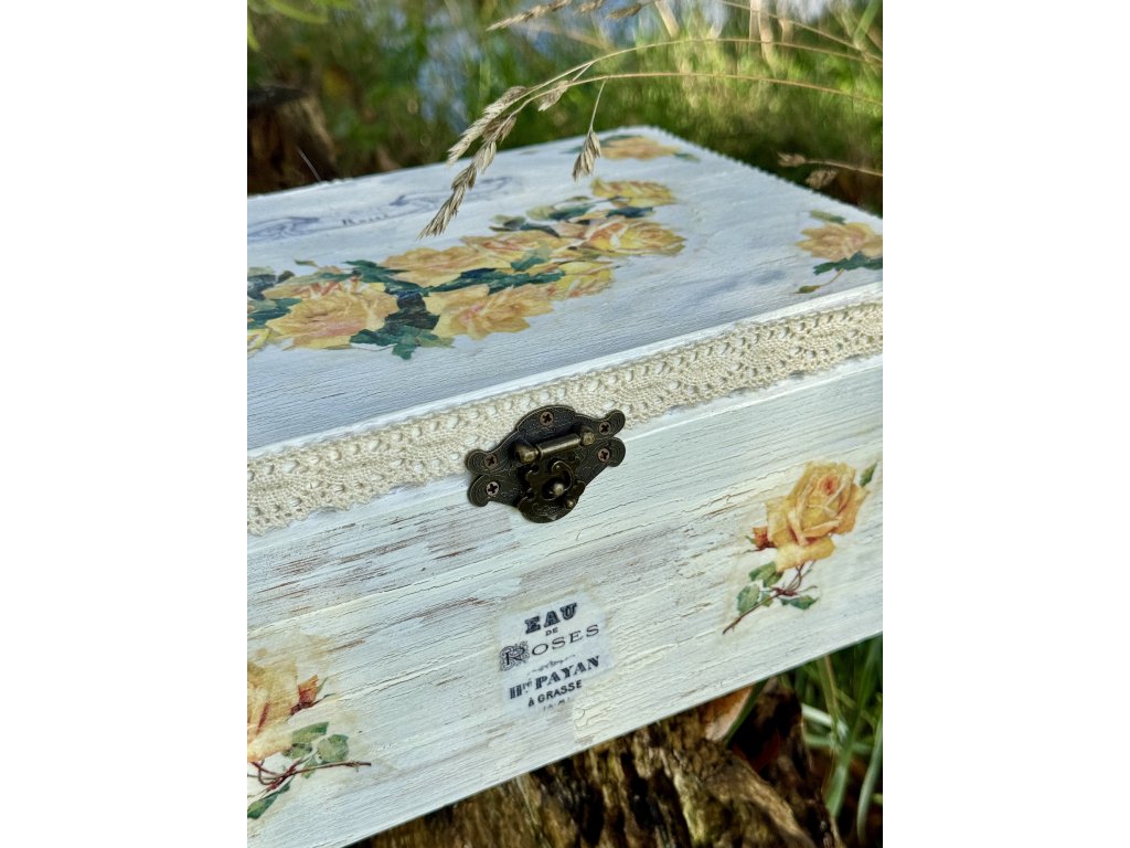 Každý detail této krabičky byl zdoben s láskou a trpělivostí. Velká dřevěná krabička s jemným vintage zdobením a motivem žlutých růží je ideálním místem pro tvé poklady, šperky nebo vzpomínky. 🌿✨