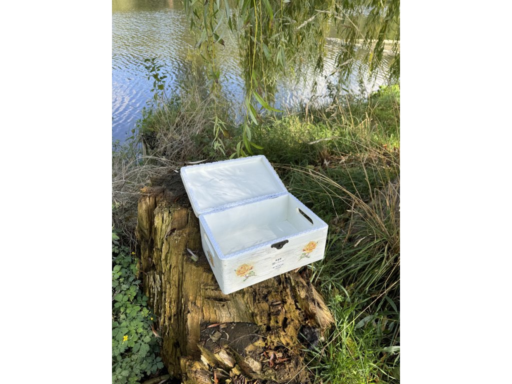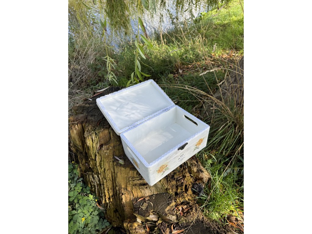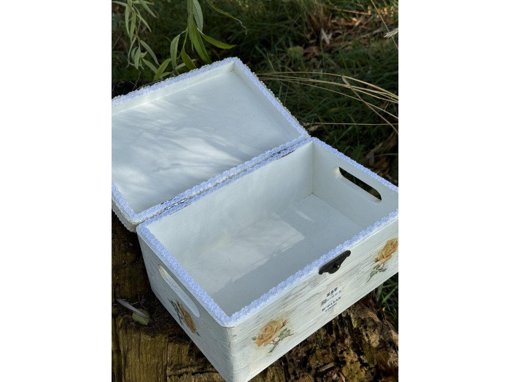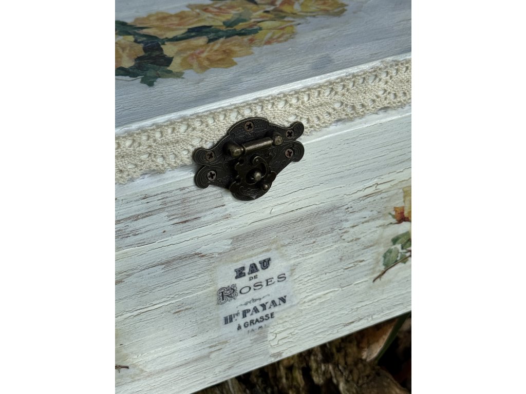 Každý detail této krabičky byl zdoben s láskou a trpělivostí. Velká dřevěná krabička s jemným vintage zdobením a motivem žlutých růží je ideálním místem pro tvé poklady, šperky nebo vzpomínky. 🌿✨